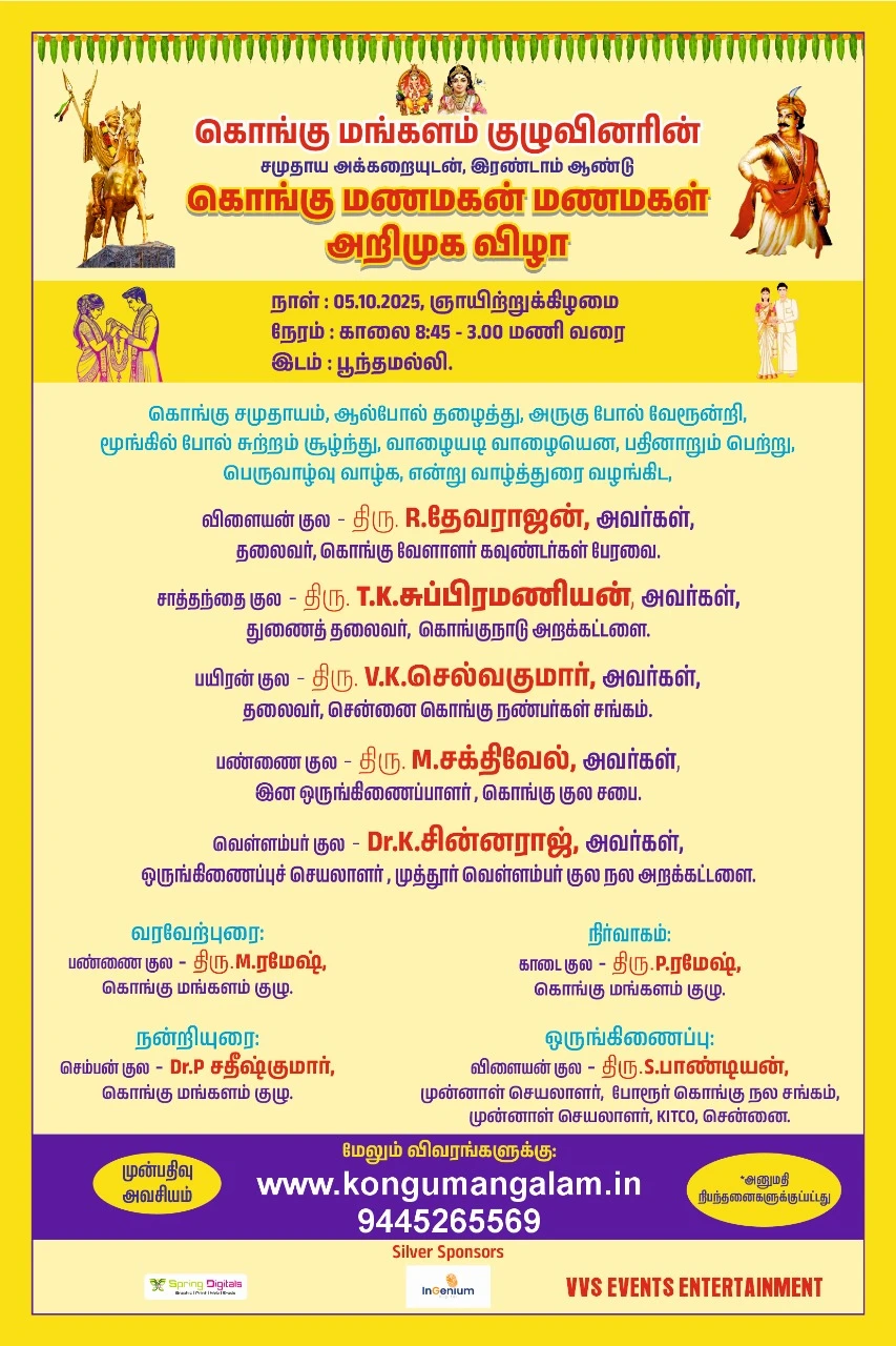 கொங்கு மங்களம் குழுவினரின் இரண்டாம் ஆண்டு கொங்கு மணமகன் மணமகள் அறிமுக விழா விரைவில்- நமது சிங்காரச் சென்னையில்- 5.10.2025.